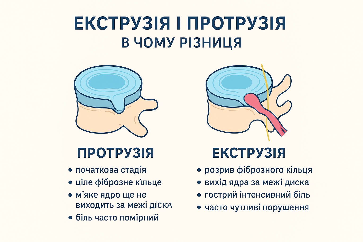 Проблеми з міжхребцевими дисками — одна з найчастіших причин болю у спині. Часто люди чують діагнози “протрузія” або “екструзія”, але не розуміють, чим вони відрізняються і який ступінь небезпеки несуть.